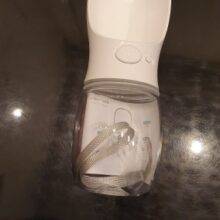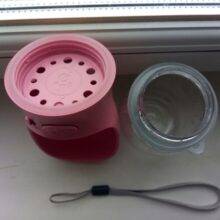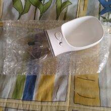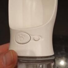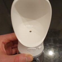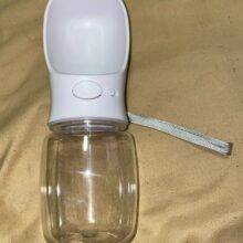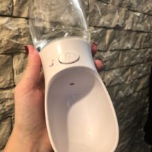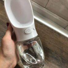 This is a great little dog water bottle that is very convenient! When we travel, I keep it in one of the cup holders because it fits nicely there. It took a few washings to reduce the plasticy smell but it was fine after that.