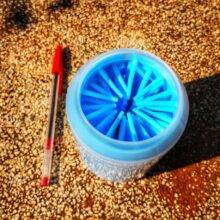 My chihuahua reluctantly agreed to let my grandson clean his paws with this paw cleaner. It consists of a sturdy plastic cup with soft, silicone fingerlets inside for cleaning. Just fill the cup about 3/4 full with warm soapy water and put the dogâs paw in a few times. The paw comes clean in a jiffy. Repeat on the other 3 paws. It can be used on a little or a big dog. Itâs portable so itâs good to take camping, to the park, or to use at home.